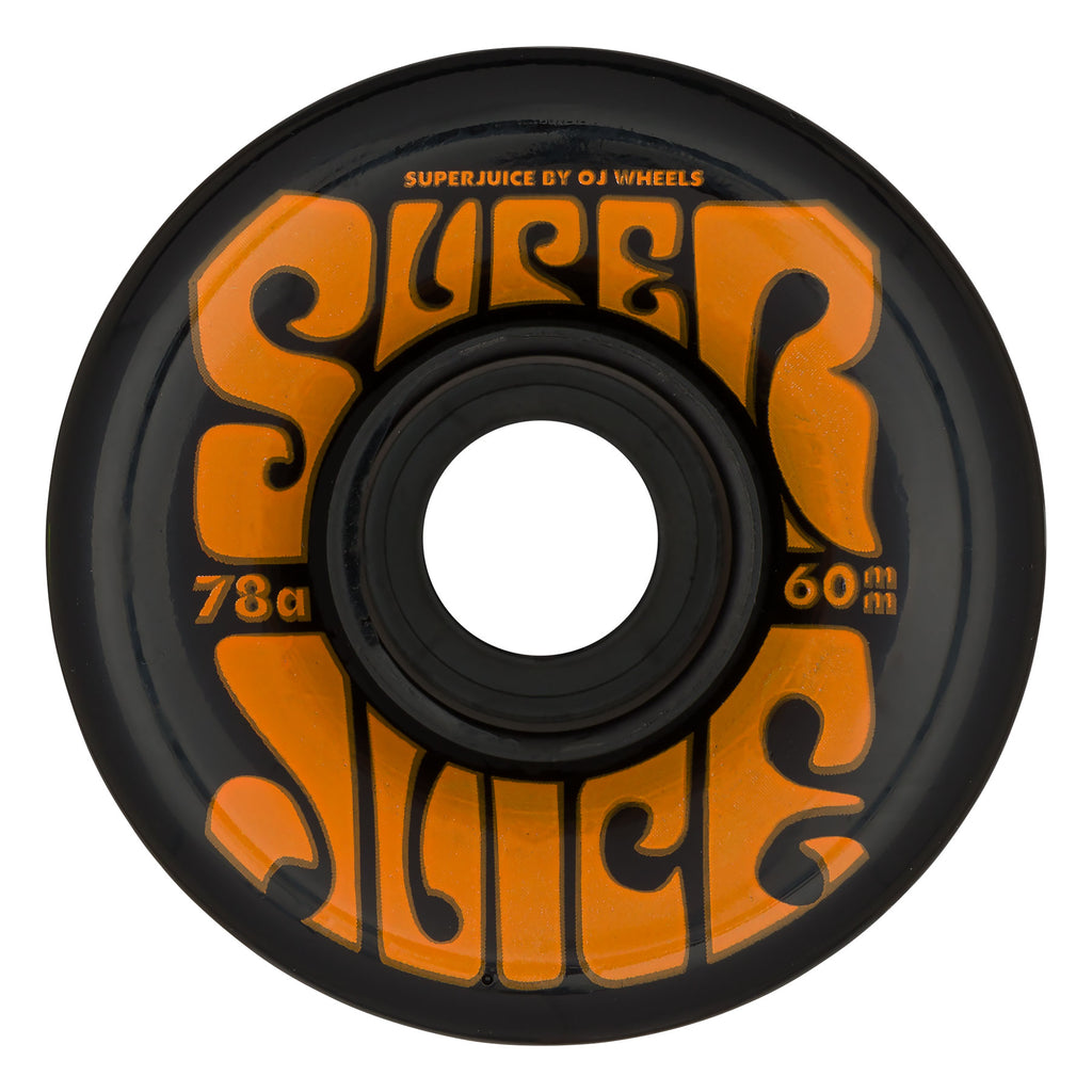 "OJ WHEEL SUPERJUICE BLACK 78A 60MM - Features a new reinforced plastic core & completely redesigned shape, all on OJs' classic ultra buttery 78a urethane. "