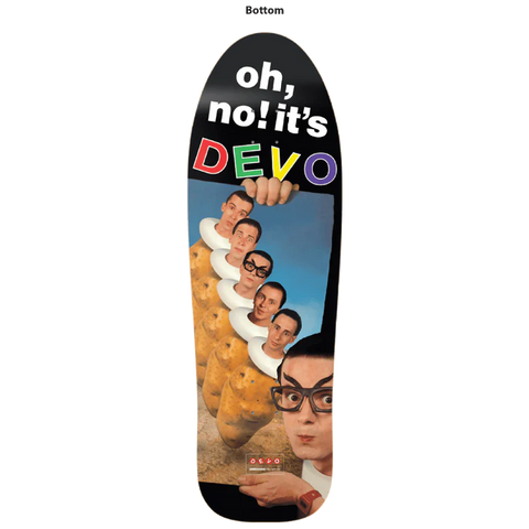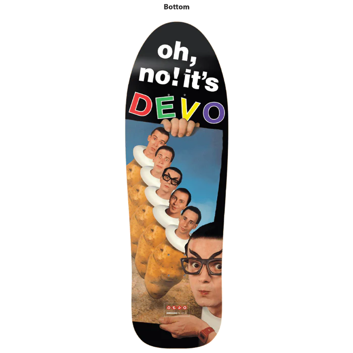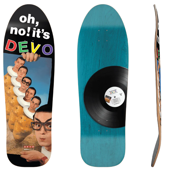 This “Oh No! It's Devo” board is part of a 5 board series of DEVO’s 1st 5 Album Boards! in collaboration with ‘Perez With Saiz.’ This tribute board references DEVO’s 4th album, “Oh No! It's Devo,” Released in 1982. The top graphic features the record label of songs and credits.